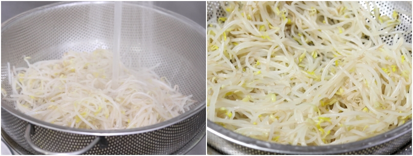 3. 데친 숙주를 바로 찬물에 두세번 헹궈 체에 받쳐 물기를 쭉~ 빼줍니다.