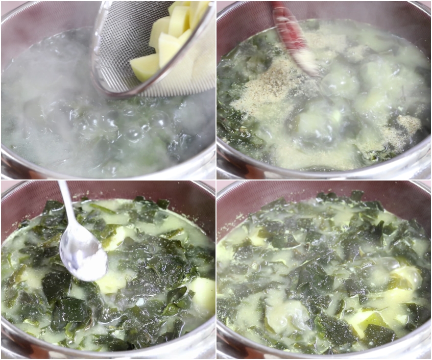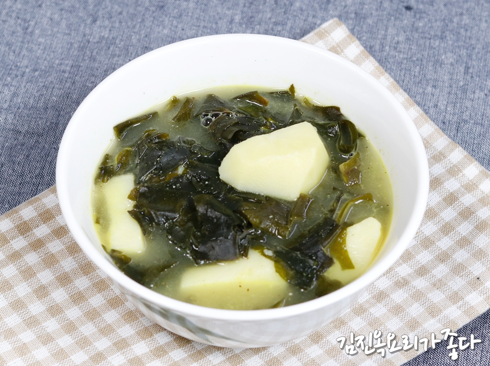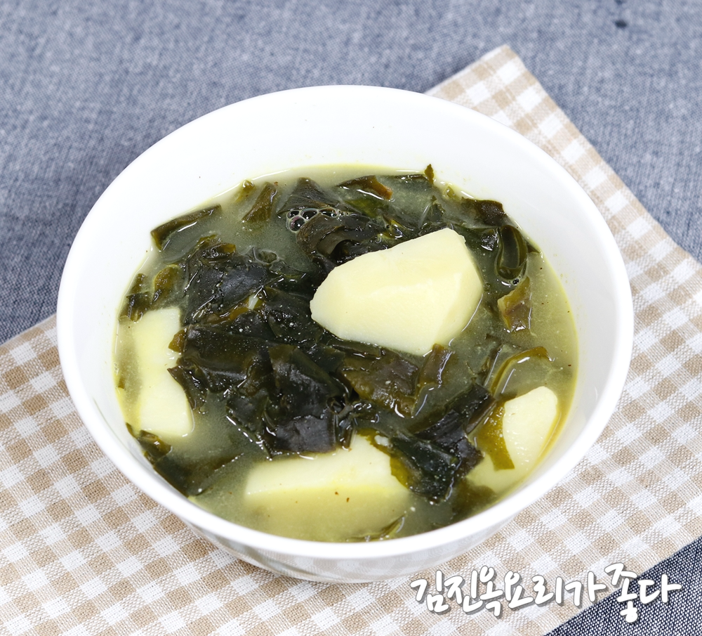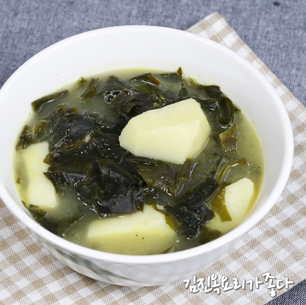 재료(4인분) : 건미역30g. 감자3개(300g). 멸치다시마육수600ml. 물800ml. 다진마늘1T.