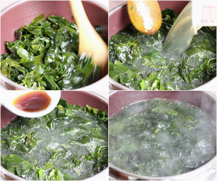 4. 냄비에 불린 미역을 넣고요~ 들기름1T를 넣은후 1분정도 중불에서 볶다가